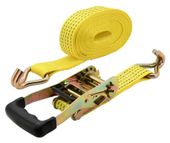 Zaciskowy pasek z grzechotką z metalowymi haczykami, z atestem TÜV / GS, do zabezpieczania ciężkich ładunków. Grzechotka to całkowicie metalowa konstrukcja z trwałym mechanizmem zabezpieczającym, wyposażona w plastikowy uchwyt zapewniający wygodną obsługę. Taśma o szerokości 50 mm i długości 8 m charakteryzuje się wytrzymałością na rozciąganie 5000 kg (po okrążeniu ładunku). Do mocowania ładunku zalecamy stosowanie plastikowych narożników lub tulei ochronnych. Bez użycia ochronnych rękawów lub narożników wytrzymałość pasów jest zmniejszona i zużycie.