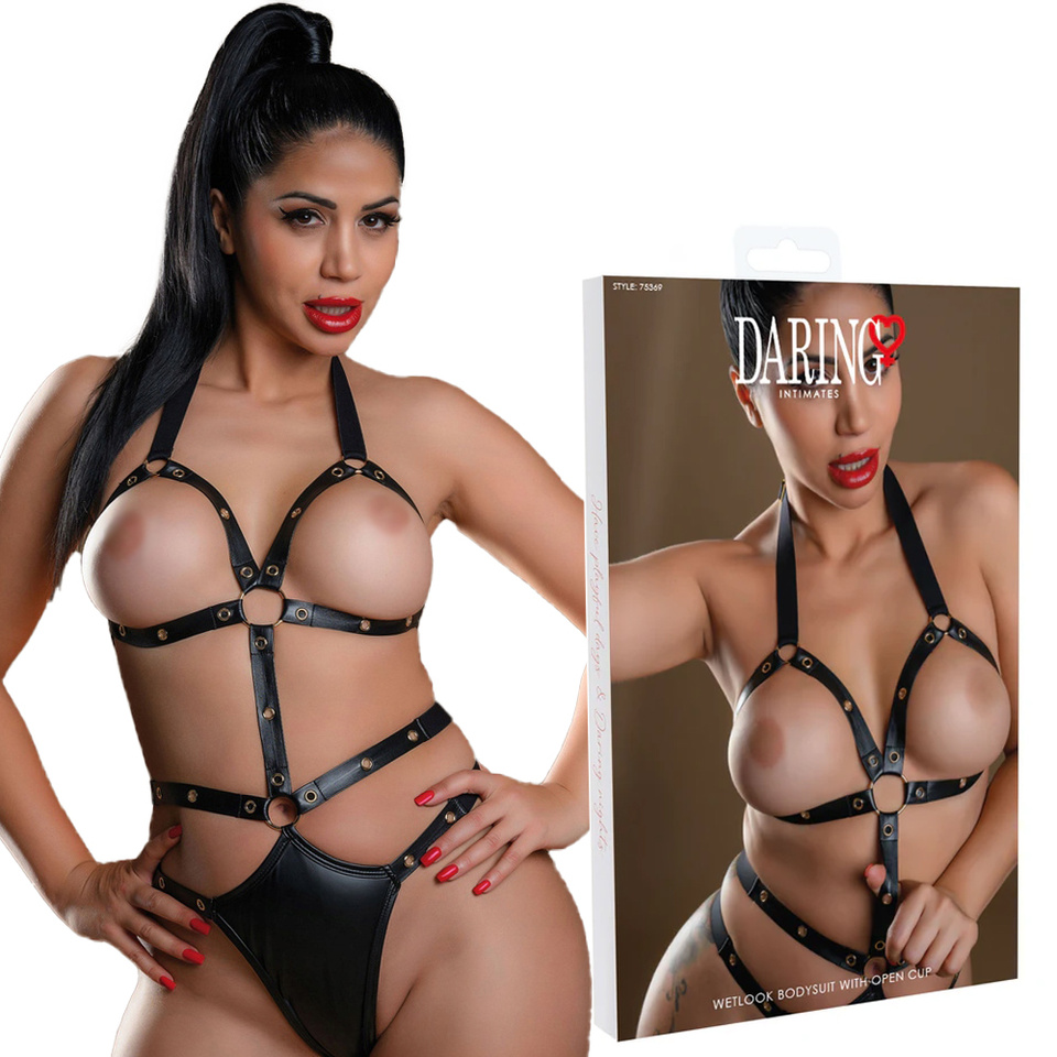 Ten odważny element ma biustonosz z otwartymi miseczkami, zapewniając wyjątkowo seksowną i odważną noc.