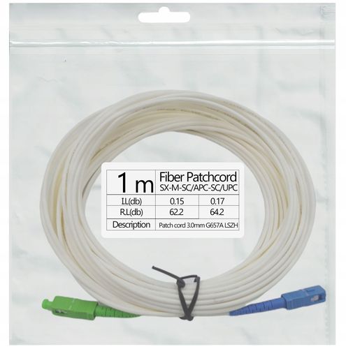 Nasze patchcordy o długości 1.00 m i kolorze białym lub żółtym są dostępne z złączami typu SC/UPC (niebieskie) na jednym końcu i SC/APC (zielone) na drugim. Taki dobór złącz zapewnia wyspecjalizowaną wymianę danych, co znacząco wpływa na stabilność i jakość sygnału.