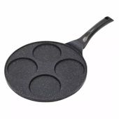 Patelnia do placków i jajek 26,5 cm pozwoli przygotować efektowne śniadanie i desery (jajka, placki ziemniaczane, jabłkowe czy marchewkowe, pancake's lub mini naleśniki). Wykonana z masywnego odlewanego aluminium. Pokryta marmurkową powłoką nowej generacji. W odróżnieniu od klasycznych, lekkich patelni ta nagrzewa się mocniej i trzyma temperaturę dłużej.