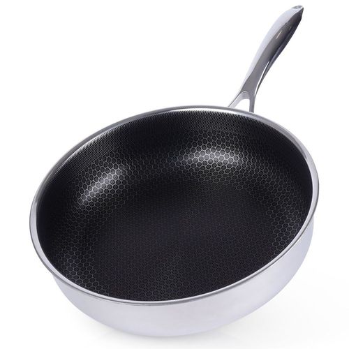 NIEZAWODNA - Patelnia klasy premium wykonana z najwyżej jakości stali nierdzewnej z powłoką nieprzywierającą o średnicy 28 cm. Wymiary zewnętrzne: długość 50 cm, wysokość patelni 7,5 cm, wysokość z rączką 10 cm. Patelnia jest wytrzymała i trwała. Patelnia jest z unikatowej serii COOKCELL HYBRYD.