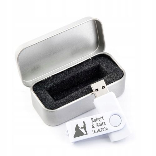 Pendrive dostarczany jest w stylowym, srebrnym pudełku, które może być również opcjonalnie ozdobione takim samym grawerem co urządzenie. To sprawia, że cały zestaw staje się wspaniałym prezentem na wiele okazji, takich jak ślub, chrzciny czy urodziny.