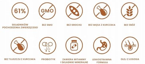 Karma zawiera starannie dobrane naturalne składniki takie jak suszone algi, cykoria, siemię lniane, jukka mojave oraz probiotyki, które wspierają prawidłowe funkcjonowanie układu pokarmowego, detoksykację i równowagę flory bakteryjnej.