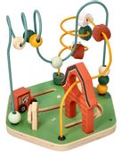Na dwóch metalowych kolorowych prętach (zielony, żółty) znajdują się drewniane koraliki, którymi dziecko może przesuwać w dowolny sposób, ćwicząc przy tym precyzję ruchów palców i dłoni. Na pętlach łącznie znajduje się 14 drewnianych klocków i koralików. Na jednej z pętli znajdują się przeszkody co utrudnia nieco zadanie przesuwania koralików. Dodatkowo podstawa zabawki tworzy tor po którym farmer na traktorze może jeździć i pilnować swojego dobytku.