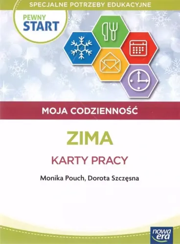 Pewny Start. Moja Codzienność. Zima. Karty pracy to 100 kart, które rozwijają poznawczo oraz ćwiczą umiejętności związane z funkcjonowaniem społecznym. Cele kart: