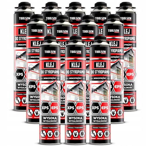Zestaw 12 tub poliuretanowego kleju do styropianu TOOLSEN model do XPS i EPS wyróżnia się niezrównaną przyczepnością do większości podłoży budowlanych, takich jak cegła, beton czy drewno. Jego formuła zapewnia precyzyjny montaż płyt izolacyjnych, wypełniając nawet najmniejsze szczeliny i gwarantując stabilne połączenie bez mostków termicznych.