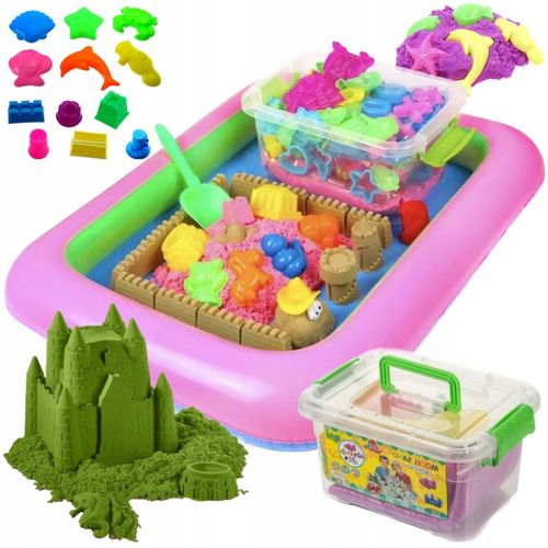 Bogaty zestaw 12 różnorodnych foremek (6 w kształcie zwierzątek i 6 do budowania) wraz z profesjonalnymi narzędziami umożliwia tworzenie nieskończonej ilości konstrukcji, zamków i figur. Duża piaskownica o wymiarach 62x50cm zapewnia wystarczająco dużo miejsca na kreatywną zabawę, a dołączona pompka ułatwia przygotowanie przestrzeni do zabawy.