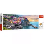 Puzzle „Vernazza o zachodzie słońca” przedstawiają malowniczy, panoramiczny widok jednego z włoskich miasteczek nad morzem w świetle zachodu słońca.