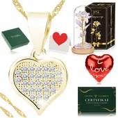 Odkryj niezrównane piękno i elegancję z naszym niezwykłym zestawem: Złoty Łańcuszek Damski z Serduszkiem z Cyrkoniami oraz Różą Wieczną LED!