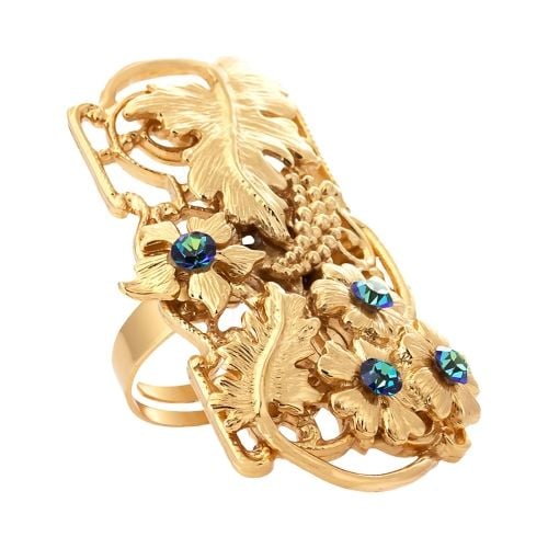 Urokliwy pierścionek z możliwością regulacji, zdobiony subtelnym motywem kwiatów i liści, zdobiony kryształkami Preciosa. Kryształki dodają mu eleganckiego blasku, pięknie odbijając światło i podkreślając detale florystycznego wzoru. Regulowana obrączka zapewnia idealne dopasowanie do każdego palca, gwarantując wygodę i łatwość noszenia. To biżuteria doskonała dla osób, które cenią naturalne motywy i subtelny, lecz wyrazisty styl. Wymiary ozdoby 4,5cm/2,5cm.