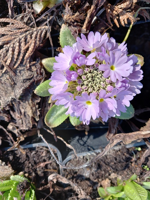 Rozetowata bylina o liściach skórzastych, pomarszczonych, ząbkowanych, długości 7-10 cm. Pędy kwiatostanowe mocne i sztywne, wys. 10-20, a nawet 30 cm, rozwijające się przed liśćmi. Kwiaty zebrane w kuliste kwiatostany, barwy purpuroworóżowej lub ciemnolila, drobne, średnicy 1 cm.
