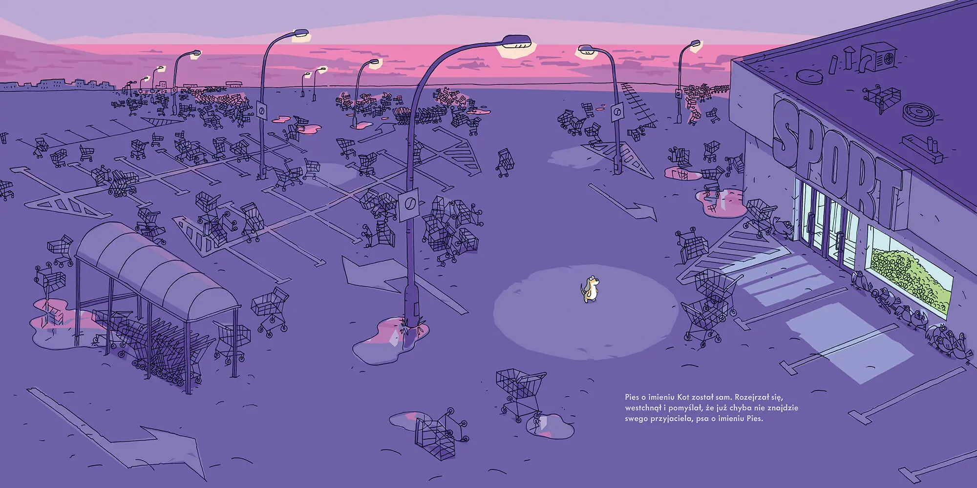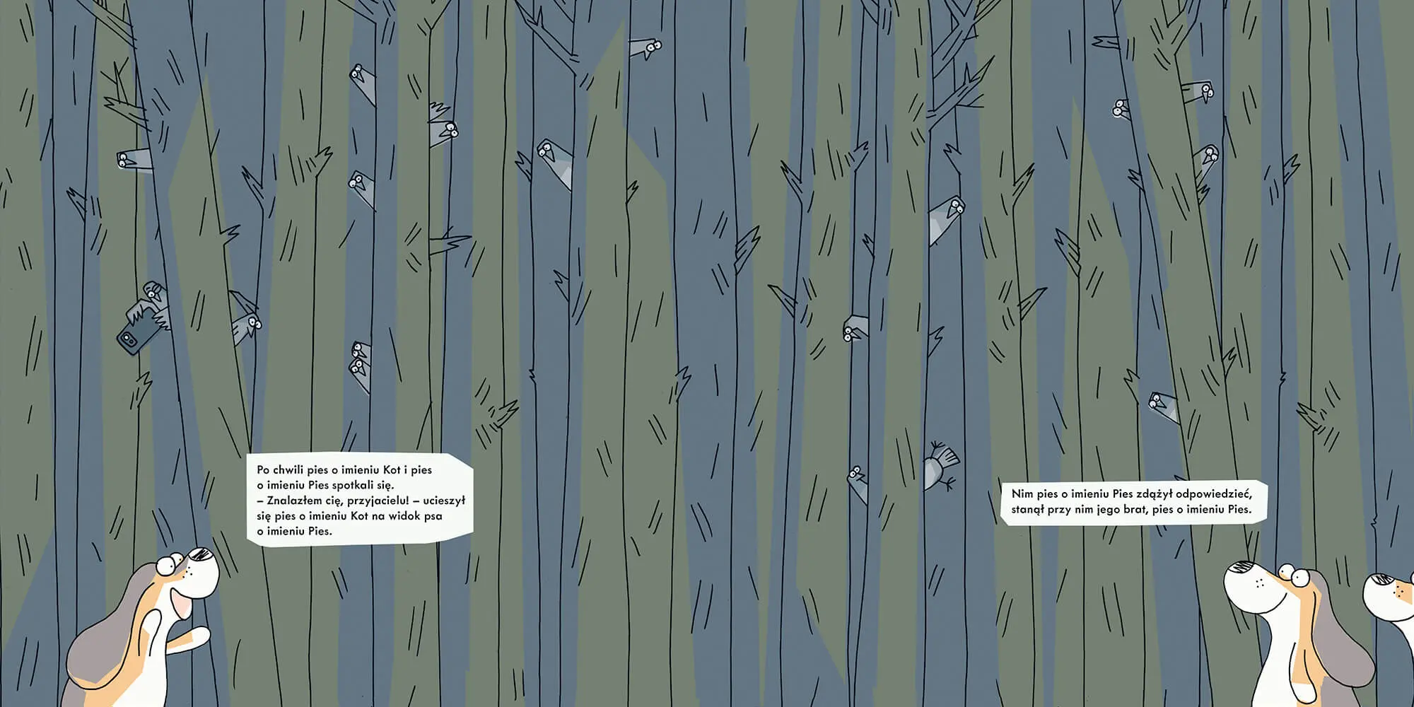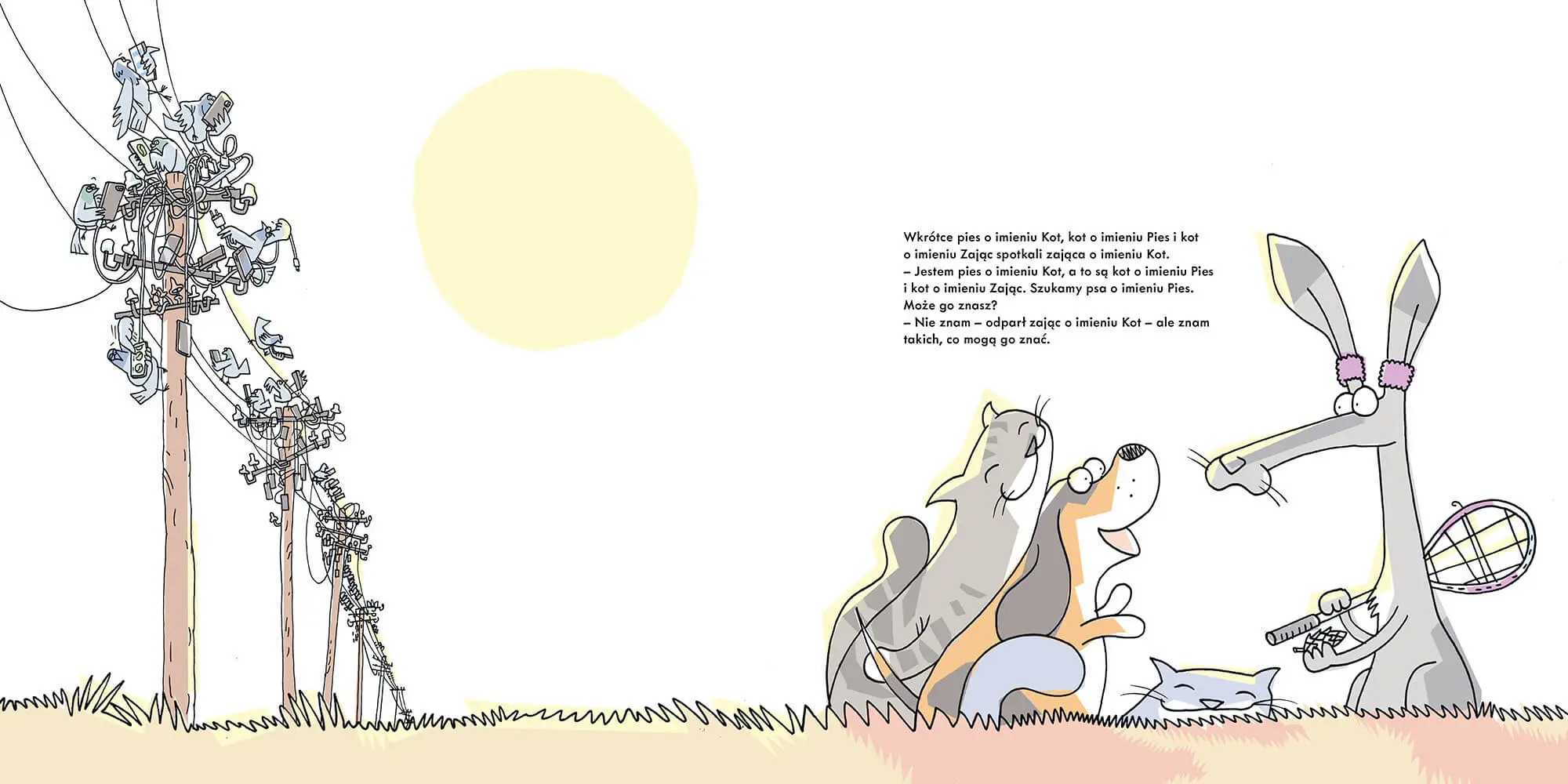 Imiona nadawane zwierzętom potrafią zaskakiwać. Czasem odzwierciedlają charakter stworzenia, innym razem inspirowane są wyglądem, a jeszcze innym – wywodzą się z sentymentu właściciela. Skąd wziął się pomysł, by kot nosił imię Pies, a pies imię Kot; pies imię Pies albo Zając, wie tylko Przemysław Wechterowicz, którego książka Pies o imieniu Pies wprawia w osłupienie i bawi do łez. Historia psa o imieniu Kot, który rusza na poszukiwania swojego przyjaciela – psa o imieniu Pies – a po drodze spotyka wiele chcących mu pomóc zwierząt, rozgrywa się równolegle w słowach i obrazach. Przewrotny tekst idzie w parze z kolorowymi, nietuzinkowymi ilustracjami Bartosza Minkiewicza, którym warto dobrze się przyjrzeć, by odkryć jeszcze więcej nieoczekiwanych wydarzeń i bohaterów. Dlaczego warto podarować tę książkę dziecku: • intrygująca historyjka; • nietuzinkowi bohaterowie; • wyjątkowy humor.