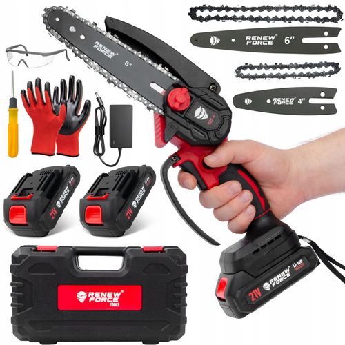 Obsługa piły RENEW FORCE® jest intuicyjna i szybka. Wystarczy założyć prowadnicę z łańcuchem, wsunąć naładowany akumulator i wcisnąć blokadę bezpieczeństwa. Dzięki ergonomicznemu uchwytowi i lekkiej konstrukcji możesz ciąć z maksymalną kontrolą i minimalnym wysiłkiem. Osłona łańcucha chroni Cię przed odpryskami, a gumowana rękojeść zapewnia stabilność. Cały proces montażu i wymiany elementów opisano w instrukcji – krok po kroku.