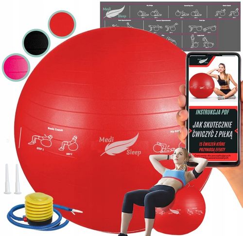 W zestawie znajduje się nie tylko wytrzymała piłka z wytrzymałego PCV, ale także duża pompka nożna do szybkiego napełniania oraz dwa korki zabezpieczające przed utratnią powietrza. Dodatkowo, otrzymasz elektroniczną instrukcję "Jak Skutecznie Ćwiczyć z Piłką" od Medi Sleep!