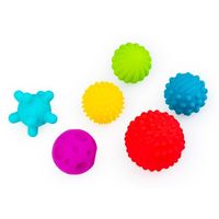 Zabawa w odkrywanie zróżnicowanych faktur i stymulowanie zmysłu dotyku do sensorycznego poznawania świata! Zestaw zawiera sześć miękkich piłeczek, a każda z nich różni się kształtem, kolorem oraz wypustkami. Nieregularna powierzchnia zabawek i ich rozmiar, dostosowany do małych rączek, ułatwi bobasowi chwytanie piłeczek.