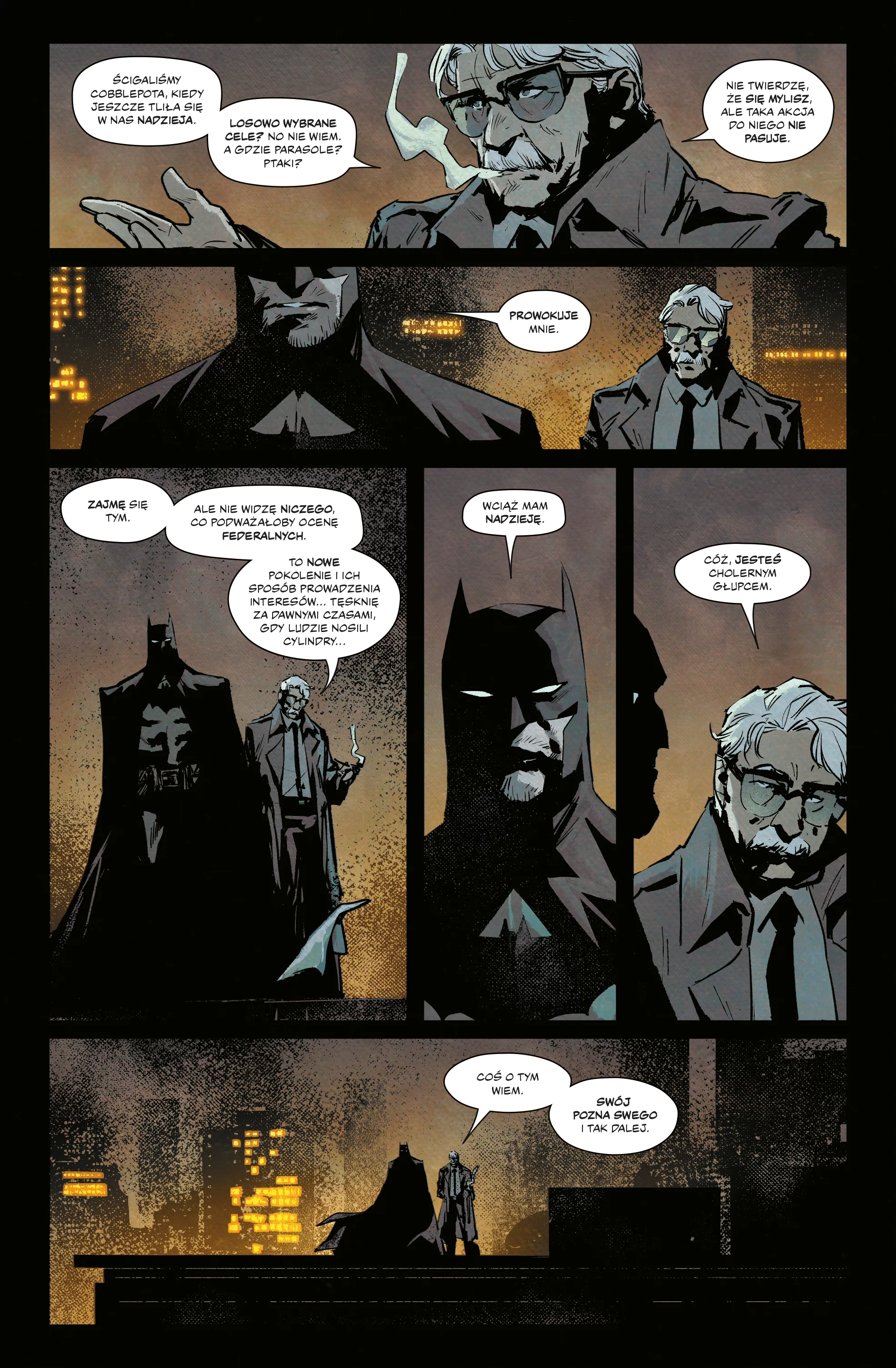 Powrót Pingwina do Gotham okazał się czymś więcej niż tylko powrotem do domu. Jego bezwzględne, żądne krwi dzieci, które odziedziczyły jego przestępcze imperium – utknęły między młotem a kowadłem. Konkretniej: między Pingwinem, Batmanem a całym podziemnym światem Gotham. Nikt nie umknie przed gniewem Oswalda Cobblepota i krucjatą Batmana. Pingwin zebrał swoich zbirów, Asystenta i informatora... aby ponownie zasiąść na tronie w Gotham. Jak daleko się posunie, aby odzyskać przestępcze imperium? Ile krwi trzeba będzie przelać? Jeszcze nie widzieliście czegoś takiego... Tom King („Batman”, „Człowiek Cel”), Rafael De Latorre („Daredevil”) i Marcelo Maiolo („Amazons Attack”) kończą opowieść o odkupieniu i zemście Pingwina. Album zawiera materiały opublikowane pierwotnie w amerykańskich zeszytach „The Penguin” #8–12. Scenarzysta: Tom King Ilustrator: Rafael De Latorre Tłumacz: Tomasz Sidorkiewicz