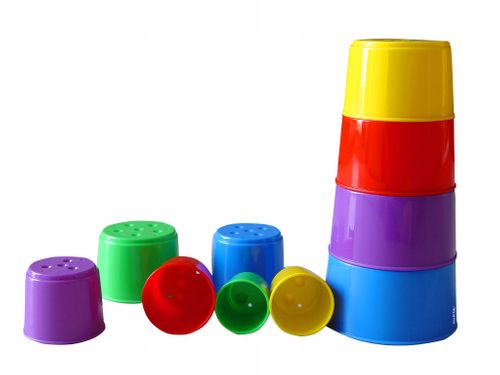 Kolorowe kubeczki można układać na wiele sposobów nakładając jeden na drugi i tworząc z nich piramidki. na kubeczkach znajdują się wypustki (rożna ilość w zależności od wielkości kubeczka) i dziurki przez które można przelewać np. wodę.