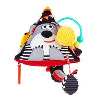 Wielofunkcyjna zabawka pełna zwierzątek i sensorycznych niespodzianek zapewni maluchowi wspaniałą rozrywkę! Na każdej z mięciutkich ścianek piramidki kryją się inne skarby, a wśród nich: piszczałka, bezpieczne lusterko do samopoznania dzidziusia, otoczone materiałowymi metkami, a nawet tasiemki do przeciągania, ozdobione mniejszymi zabaweczkami, w tym pszczółką, którą można włożyć do specjalnej kieszonki. Znajdziemy tu także gryzak z wypustkami, który z pewnością przyda się podczas ząbkowania, przynosząc ulgę obolałym dziąsłom malucha. Praktyczny uchwyt w formie pałąka z koralikami do przesuwania paluszkiem, ułatwi podnoszenie zabawki. Zróżnicowane materiały, z których uszyta została piramidka, stymulować będą zmysły bobasa, inspirując go do sensorycznego poznawania świata.