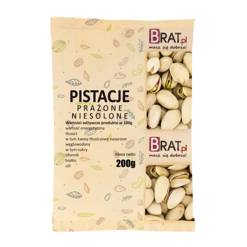 Opakowanie zawiera 200 g pistacji prażonych niesolonych.