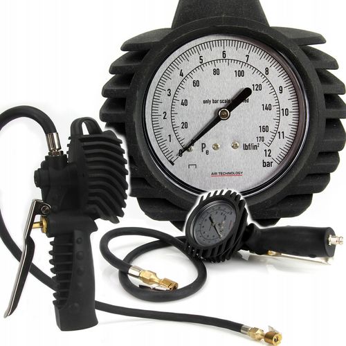 Czytelny zegar 0-12 bar. To profesjonalny pistolet do pompowania kół, wyposażony w precyzyjny zegar do pomiaru ciśnienia.