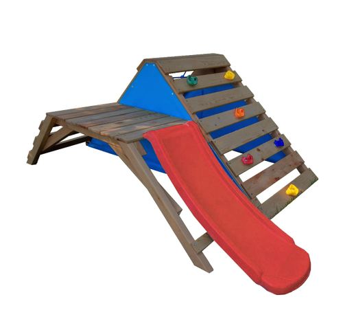 Plac zabaw do ogrodu First - to idealne rozwiązanie dla rodzin z dziećmi, które chcą stworzyć w swoim ogrodzie przyjazne i bezpieczne miejsce do zabawy i aktywności fizycznej. Plac zabaw składa się z drewnianej platformy, z której można zjechać zjeżdżalnią. Również zestaw zawiera różnorodne elementy do wspinaczki, takie jak chwyty wspinaczkowe i linowe siatki.