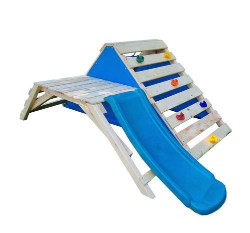Plac zabaw do ogrodu First - to idealne rozwiązanie dla rodzin z dziećmi, które chcą stworzyć w swoim ogrodzie przyjazne i bezpieczne miejsce do zabawy i aktywności fizycznej. Plac zabaw składa się z drewnianej platformy, z której można zjechać zjeżdżalnią. Również zestaw zawiera różnorodne elementy do wspinaczki, takie jak chwyty wspinaczkowe i linowe siatki.