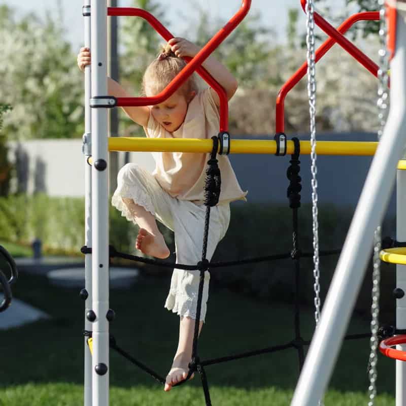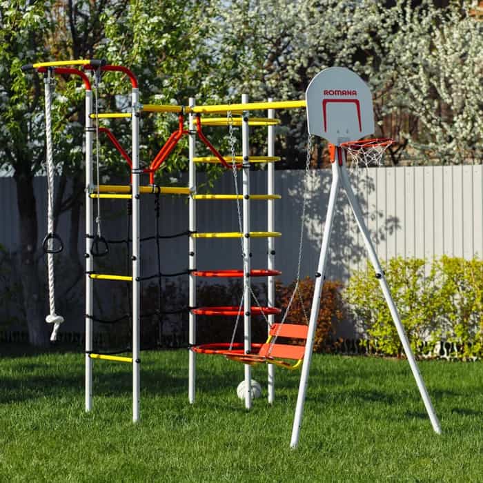 Plac zabaw do ogrodu Stacja Kosmiczna to świetny zestaw dla każdego dziecka! Połączenie drabinki gimnastycznej, siatki wspinaczkowej, tunelu teleskopowego oraz innych akcesoriów czyni ten plac niezwykłym miejscem do zabaw dziecięcych na świeżym powietrzu. Kącik zabaw to doskonałe miejsce, aby rozładować niespożytkowaną energię dziecka – pozwala na wszelkie możliwe aktywności takie jak podciąganie, wspinanie się, bujanie, skakanie czy rzucanie piłką do kosza. Plac zabaw ogrodowy dla dzieci Stacja Kosmiczna jest wyposażona dodatkowo w kółka gimnastyczne oraz linę. Metalowa konstrukcja ogrodowego placu zabaw pozwala na montaż dodatkowych akcesoriów sportowych, co wzbogaca i urozmaica zabawę oraz pozwala dostosować plac zabaw do wieku i upodobań dziecka. Aktywność na świeżym powietrzu jest bardzo ważna dla ogólnego rozwoju każdego dziecka, poza tym zestaw pozwala rozwijać koordynację ruchową, siłę mięśni rąk oraz poprawić ogólną sprawność fizyczną dziecka. Drążek gimnastyczny, umieszczony na samej górze drabinki jest świetnym przyrządem do ćwiczeń dla nastolatków oraz dorosłych, którzy regularnymi ćwiczeniami mogą dać dobry przykład dzieciom.