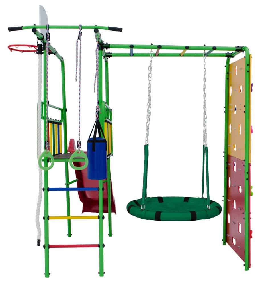 Plac zabaw do ogrodu Tęcza – wielofunkcyjny zestaw gimnastyczny o solidnej metalowej konstrukcji. Posiada zestaw dodatkowych akcesoriów, takich jak kółka gimnastyczne, worek bokserski, drabinka pozioma czy ścianka wspinaczkowa, które dopełniają ten ogrodowy plac zabaw i zapewniają mu dodatkowe funkcje. Oprócz wielu walorów użytkowych ten plac zabaw w ogrodzie jest jednocześnie niezwykle atrakcyjny. Posiada nowoczesne elementy w żywych kolorach, które od razu przyciągają wzrok – nie tylko dzieci, ale i dorosłych.