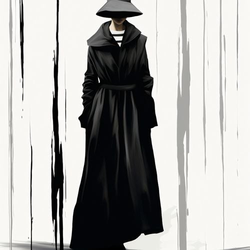Plakat z serii wnętrza zatytułowany Mroczna Taina. Enigmatyczna postać w czarnym płaszczu i szerokim kapeluszu ukrywa swoją tożsamość, podkreślając aura tajemniczości. Czarno-białe tło z pionowymi smugami przypominającymi deszcz lub płynący atrament dodaje głębi i dramatyzmu kompozycji. Subtelne niuanse światła i cienia grają na powierzchni płaszcza, tworząc atmosferę intrygi i nieokreślonego niebezpieczeństwa. Świetnie sprawdzi się w nowoczesnych galeriach sztuki, luksusowych hotelach o minimalistycznym designie oraz w przestrzeniach przeznaczonych dla miłośników noir i kryminałów.