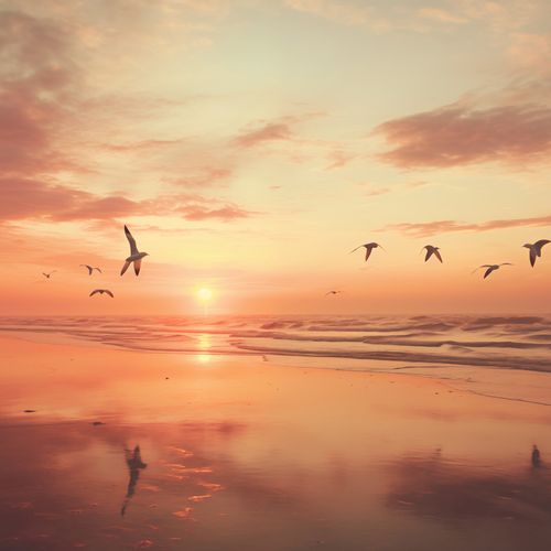 Plakat z serii pejzaże zatytułowany Spokojna Przystań przedstawia idylliczny wschód słońca nad morzem, gdzie złociste promienie światła tańczą po delikatnie falującej powierzchni wody. Sylwetki mew unoszących się na ciepłym powietrzu dodają uczucia wolności i bezkresu. Rozmyte odbicia ptaków na mokrym piasku nadmorskim wzbudzają uczucie spokoju i kontemplacji. Ten plakat jest kwintesencją ukojenia, idealny do wnętrz o tematyce nadmorskiej, czy to w prywatnych rezydencjach pragnących złapać oddech od miejskiego zgiełku, jak i w przestrzeniach wellness, spa, czy hotelowych lobby, gdzie głównym celem jest relaks i odprężenie.