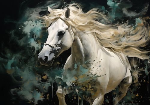 Plakat z serii natura zatytułowany Dziki Duch – dynamiczna i wyrazista kompozycja przedstawiająca arystokratycznego białego konia w pełnym galopie. Kontrast między elegancją czystej bieli sierści konia a dzikim, abstrakcyjnym tłem w odcieniach głębokiego błękitu i czerni podkreśla siłę i energię tego majestatycznego zwierzęcia. Włosy grzywy i ogona konia są przedstawione z niezwykłą szczegółowością, co daje efekt ruchu i życia. Drobne akcenty kolorystyczne w tle dodają dziełu głębi i tekstury, sprawiając, że plakat wydaje się prawie trójwymiarowy. Ten plakat to idealny wybór dla miłośników koni i natury, doskonale wkomponuje się w przestrzenie, które cenią sobie siłę, wolność i piękno natury.