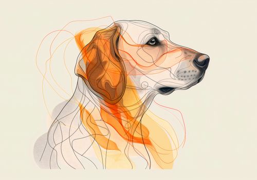 Plakat z serii abstrakcja zatytułowany Kontur Profilowego. Plakat przedstawia portret psa w stylu artystycznym, z subtelnie zaznaczonymi, ale wyraźnymi cechami. Kompozycja łączy realistyczne detale takie jak oczy, nos i uszy z abstrakcyjnymi, płynnymi liniami i plamami kolorów, które tworzą wrażenie ruchu i głębi. Dominujące kolory to odcienie pomarańczowego, żółtego i brązu, które idealnie oddają ciepło i przyjazny charakter zwierzęcia. Tło w neutralnym, pastelowym odcieniu podkreśla i równoważy bardziej dynamiczne elementy grafiki. Plakat emanuje spokojem i może wzbudzać pozytywne emocje, będąc jednocześnie wyrafinowanym, artystycznym przedstawieniem psa, który może być ulubieńcem rodziny lub po prostu przykuwającym uwagę elementem dekoracyjnym.