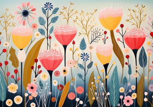 Plakat z serii abstrakcja zatytułowany Ogród Marzeń to urokliwa kompozycja, która przyciąga wzrok żywą paletą barw i abstrakcyjnym przedstawieniem natury. Każda kwiatowa forma jest tu celebracją różnorodności i piękna, od wyrafinowanych, wysmukłych pędów po pełne uroku, rozłożyste płatki. Subtelne detale, takie jak kropki na liściach czy delikatne linie na płatkach, dodają dziełu głębi i tekstury. Ta bujna, kwitnąca łąka jest wizją natury, która przenosi widza w świat fantazji i spokoju. Idealnie sprawdzi się jako centralny punkt w nowoczesnych przestrzeniach mieszkalnych, w pokojach relaksu, a także w przestrzeniach komercyjnych, takich jak spa, salony piękności lub poczekalnie, gdzie wprowadzi atmosferę spokoju i harmonii.