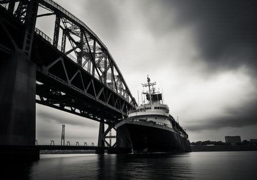Plakat z serii pejzaże zatytułowany Statek przy Moście. Monochromatyczne przedstawienie statku pod imponującym mostem, gdzie struktury inżynieryjne łączą się z dynamicznym niebem, tworząc kompozycję symbolizującą siłę i postęp. Chłodna paleta barw i silne linie prowadzące oko przez obraz idealnie nadają się do nowoczesnych przestrzeni biurowych lub urbanistycznych salonów. Plakat ten przyciąga uwagę i inspiruje, odzwierciedlając majestat i piękno konstrukcji stworzonych przez człowieka.