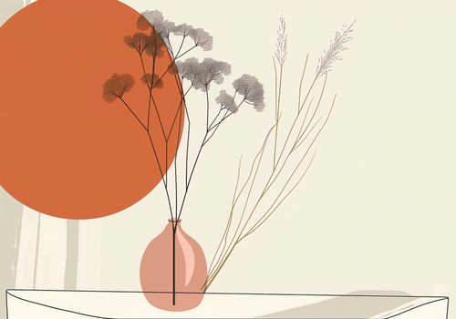 Plakat z serii boho zatytułowany Suszony Widok. Plakat ukazuje zgeometryzowane, stylizowane kwiaty suszonych roślin w wazonie na tle dużego, okrągłego słońca w ciepłych odcieniach pomarańczy i beżu. Kompozycja, w której dominują spokojne, jesiennie nastroje, łączy prostotę formy z bogactwem faktury. Plakat ten doskonale odnajdzie się w wnętrzach o prostym, lecz eleganckim wystroju, takich jak minimalistyczne salony, jadalnie czy hol. Idealnie wpasuje się w otoczenie zarówno nowoczesne, jak i te z nutą retro, wprowadzając ciepło i artystyczną, subtelność.