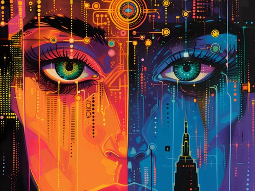 Plakat z serii abstrakcja zatytułowany Cyfrowa Psyche. Przedstawia fascynującą symetrię między ludzką urodą a technologicznym zawirowaniem. Wyraźne, zielone oczy kobiety są centralnym punktem obrazu, ożywione wizją elektronicznych obwodów i cyfrowych sygnałów, które przepływają przez i wokół jej wizerunku. Przecinające twarz linie symbolizują połączenie osobowości z nowoczesnymi technologiami, podczas gdy tło ukazuje zarys charakterystycznego krajobrazu miejskiego. Intensywne, neonowe kolory od pomarańczowego do niebieskiego nadają dziełu dynamiczny i nowoczesny charakter. Plakat ten będzie idealnym dodatkiem do współczesnych biur, salonów gier lub innych przestrzeni kreatywnych, które celebrują połączenie sztuki i technologii.