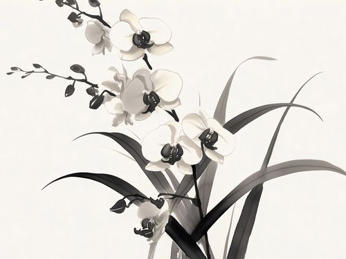 Plakat z serii wnętrza zatytułowany Orchidea. Na plakacie widoczna jest stylizowana kompozycja kwiatów orchidei, przedstawiona w monochromatycznej kolorystyce. Dominują odcienie bieli i czerni, które tworzą silny kontrast, podkreślający delikatne kształty i szczegóły płatków oraz ciemniejsze środki kwiatów. Liście i łodygi są przedstawione w odcieniach szarości, co dodaje głębi i tekstury do obrazu. Całość kompozycji jest elegancka i nowoczesna, z subtelnymi gradientami i cieniowaniem dla realizmu. Tło jest jasne, co sprawia, że kwiaty wydają się jeszcze bardziej wyraziste. Ten plakat może być interpretowany jako połączenie naturalnego piękna z minimalistyczną estetyką, idealne do nowoczesnych wnętrz, które cenią sobie prostotę i elegancję.
