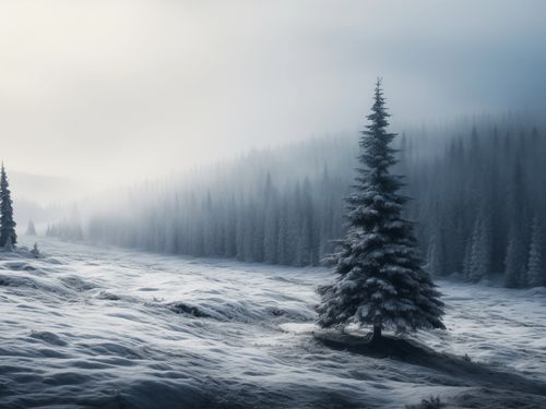 Plakat z serii pejzaże zatytułowany Samotna Choinka. Ta grafika ukazuje malowniczy, zimowy krajobraz z dominującą pojedynczą, okazałą choinką pokrytą śniegiem. Otoczona przez delikatnie zasnutej mgłą lasy, podkreśla spokój i majestatyczną ciszę zimy. Delikatne odcienie błękitu i bieli tworzą wrażenie chłodu i spokoju. Ten plakat będzie idealnym dodatkiem do każdego wnętrza, gdzie chcemy wprowadzić atmosferę spokoju i kontemplacji, świetnie sprawdzi się w przestrzeniach takich jak gabinety relaksacyjne, spa, a także jako element dekoracyjny w domowych salonach lub sypialniach.