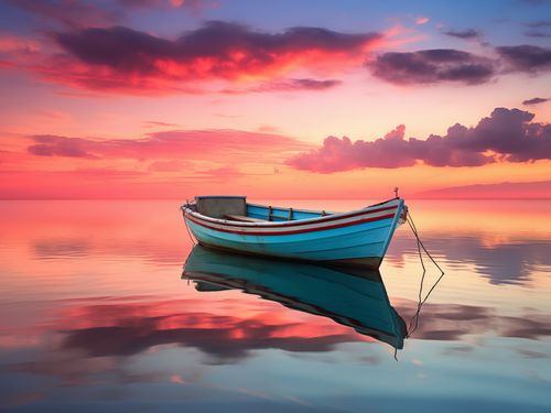 Plakat z serii pejzaże zatytułowany Spokój przed Połowem. Ta malownicza scena przedstawia samotną łódź na tafli wody, z tłem zachodzącego słońca, które barwi niebo i powierzchnię wody w odcienie czerwieni i pomarańczy. Odbicie łodzi w wodzie tworzy symetrię, która wprowadza w stan medytacji i spokoju. Plakat doskonale nadaje się do pomieszczeń, gdzie chcemy wprowadzić elementy natury i harmonii, takich jak salony, gabinety czy przestrzenie wellness.