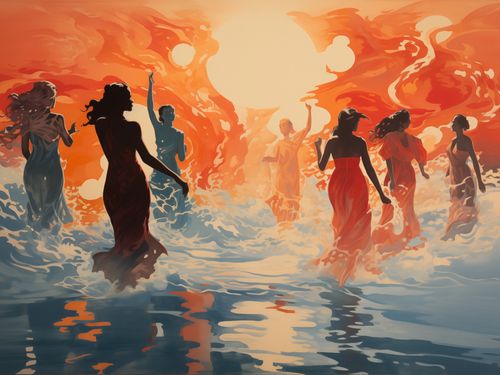 Plakat z serii wnętrza zatytułowany Taneczny Żar, przedstawia grupę osób tańczących w rytmicznych ruchach w wodzie, z tłem zapalającego się nieba w odcieniach ciepłego pomarańczu i czerwieni. Postacie są przedstawione w dynamicznych pozach, z włosami rozwianymi przez wiatr, co nadaje obrazowi wrażenie ruchu i pasji. Styl plakatu, z jego płynnymi liniami i żywymi kolorami, tworzy uczucie energii i życia. Ten plakat idealnie nadaje się do wnętrz, które chcą uchwycić esencję ruchu, radości i wolności, takich jak studia taneczne, kreatywne przestrzenie pracy, a także jako inspirujący element w domach, gdzie może stanowić przypomnienie o pięknie wspólnych chwil i celebracji życia.