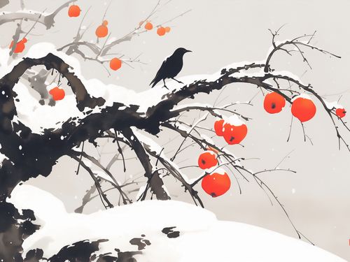 Plakat z serii motywy wschodnie zatytułowany Wschodnia Akwarela przedstawia zimowy krajobraz w stylu wschodnim. Drzewo o ciemnych, wyrazistych gałęziach pokrytych śniegiem wygina się elegancko na tle spokojnego, jednolitego tła. Na gałęziach znajdują się czerwone owoce, które mogą być symbolem persymonów lub innych zimowych owoców, kontrastujących swoim żywym kolorem z zimowym otoczeniem. Na jednej z gałęzi spoczywa czarny ptak, być może kruk, co dodaje życia i głębi kompozycji. Spadające płatki śniegu i subtelne odcienie w tle nadają scenie uczucie spokoju i ciszy. Ten plakat łączy prostotę z elegancją, mogąc stanowić wyrafinowaną dekorację w przestrzeniach szukających spokojnej, lecz wyrazistej estetyki.