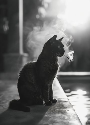 Plakat z serii wnętrza zatytułowany Kocia Przerwa. Na tym plakacie uwieczniono czarnego kota siedzącego na krawędzi, zanurzonego w promieniach rozproszonego światła, które podkreślają jego błyszczącą sierść i wyraziste kontury. Kocie wąsy delikatnie zarysowane w kontraście ze światłem nadają mu wyrazistości, a unoszący się dym tworzy aurę tajemniczości. Jest to plakat zarówno elegancki, jak i zagadkowy, idealny dla miłośników zwierząt i minimalistycznego designu. Plakat ten będzie pasował do każdego wnętrza, od klasycznego po nowoczesne, dodając subtelnego charakteru i spokoju.