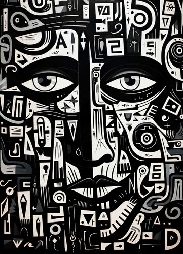 Plakat z serii abstrakcja zatytułowany Labirynt Myśli. Intrygujące oczy spoglądające z głębi obrazu są otoczone złożonymi wzorami i symbolami, które łączą się, tworząc enigmatyczny portret. Czarno-białe barwy kontrastują ze sobą, dodając dziełu intensywności i głębi. Złożoność wzorów symbolizuje skomplikowane myśli i emocje, które kryją się za ludzkim spojrzeniem. Świetnie sprawdzi się w nowoczesnych biurach, galeriach sztuki oraz w przestrzeniach przeznaczonych dla miłośników abstrakcyjnej ekspresji.