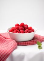 Plakat z serii wnętrza zatytułowany Lato w Misce. Na plakacie widnieje pełna misa soczystych, dojrzałych malin, które kontrastują swoją intensywną czerwienią z czystą bielą naczynia i tłem. Rozłożona obok misy czerwono-biała, kratka serwetka dodaje wiejskiego uroku, a pojedynczy listek mięty wprowadza świeży akcent. Ten plakat przyciąga wzrok swoją prostotą i elegancją, idealnie uchwycając esencję letniego sezonu i świeżości owoców. Doskonały do ożywienia kuchni, jadalni, a także jako element dekoracyjny w przestrzeniach, gdzie chce się wprowadzić nutę świeżości i naturalnego piękna. Zaprasza do celebracji zdrowego stylu życia i radości płynącej z prostych przyjemności.