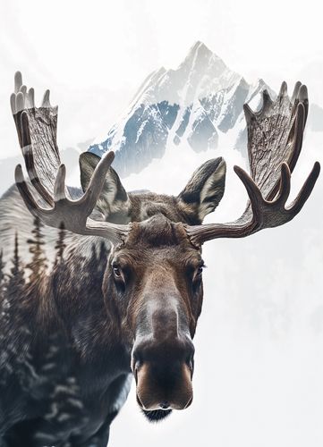Plakat z serii natura zatytułowany Łoś Duch Lasu to majestatyczne przedstawienie łosia, którego potężne poroże przeobraża się w górski krajobraz. Na pierwszym planie widzimy głęboki, przenikliwy wzrok łosia, skupionego na widzu, z pięknymi, szczegółowo odwzorowanymi detalami sierści. Jego rozłożyste poroże płynnie przeistacza się w ośnieżone szczyty, co symbolizuje jego władzę i jedność z dziką przyrodą. Jasne, lekko zamglone tło sugeruje poranne światło, dodając plakatowi poczucia tajemnicy i dzikiego piękna. Ten plakat doskonale sprawdzi się w przestrzeniach inspirowanych naturą, takich jak chaty górskie, domy myśliwskie, lub jako wyraz głębokiego szacunku dla dzikiej przyrody w salonach i przestrzeniach wspólnych miłośników natury.