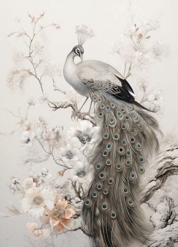 Plakat z serii wnętrza zatytułowany Pawia Gracja. Ta grafika przedstawia majestatycznego pawia spoczywającego na gałęzi, otoczonego przez delikatne kwiaty magnolii. Kunsztownie oddane detale piór i kwiatów w pastelowej palecie barw tworzą uczucie spokoju i harmonii. Plakat ten jest idealny dla miłośników piękna natury i sztuki, doskonale nadaje się do wnętrz o klasycznej i eleganckiej estetyce, takich jak salon, sypialnia, a także jako wyjątkowy element dekoracyjny w spa lub miejscach relaksacji.