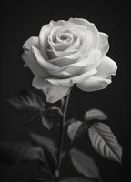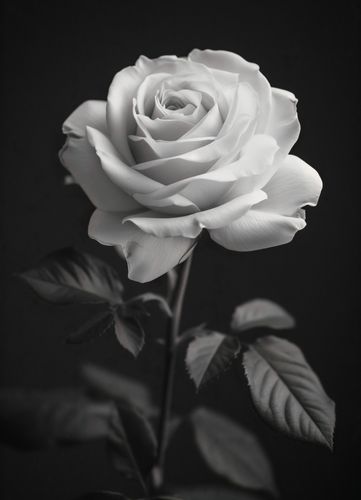 Plakat z serii wnętrza zatytułowany Płatki Róż. Plakat przedstawia ponadczasowy, monochromatyczny obraz róży. Róża, z delikatnymi i szczegółowymi płatkami, jest wyeksponowana na ciemnym tle, co wyostrza jej obrys i podkreśla subtelne niuanse jej formy. Gra światła i cienia nadaje głębi i trójwymiarowości, a ułożenie płatków w pełnym rozkwicie symbolizuje piękno i doskonałość. Liście i łodyga są skromne, ale wyraźne, dodając naturalności całej kompozycji. Plakat oddaje esencję delikatności i elegancji róży, co sprawia, że jest idealny dla każdego, kto szuka elementu dekoracyjnego o subtelnym pięknie i spokojnej, relaksującej estetyce.