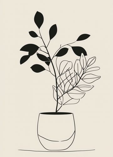 Plakat z serii minimalistyczne zatytułowany Prostota Doniczki.Plakat przedstawia elegancką kompozycję roślin w doniczce, narysowanych za pomocą czystych, prostych linii. Kontrastowe czarne liście na górze są zrównoważone przez delikatny zarys krzewu poniżej. Prosta doniczka o zaokrąglonych kształtach dodaje kompozycji nowoczesnego charakteru.Dzieło to wnoszące do wnętrza powiew świeżości i natury, jest idealnym wyborem dla przestrzeni, które cenią sobie spokój i czyste linie. Doskonale nadaje się do minimalizmu, skandynawskiego stylu mieszkania, biur, czy pokoi o jasnym wystroju, gdzie sztuka ma za zadanie uspokajać i przynosić harmonię.
