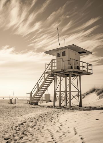 Plakat z serii pejzaże zatytułowany Strażnik Wydm. Prezentuje on sepiową scenę z wieżą ratownika na pustej plaży. Nostalgiczna tonacja obrazu podkreśla samotność struktury i piękno otaczającej ją dzikiej przyrody. Dramatyczne chmury na niebie i ślady na piasku prowadzą wzrok ku wieży, dodając głębi i historii miejscu. Ten plakat idealnie nadaje się do wnętrz, w których pragnie się wywołać uczucie spokoju, przestrzeni i czasów minionych, takich jak salony, pokoje wypoczynkowe, a także przestrzenie publiczne lub prywatne biura, które cenią sobie klasyczny wygląd i atmosferę.