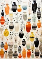 Plakat z serii wnętrza zatytułowany Symfonia Wazonów. Wspaniałe wazony w bogatej palecie kolorów, od głębokiej czerni do ciepłych odcieni pomarańczu, tworzą intrygującą mozaikę wzorów i kształtów. Delikatne motywy roślinne, które zdobią niektóre wazony, dodają uroku i lekkości, a różnorodność wzorów i faktur przyciąga wzrok i zaprasza do głębszej refleksji. Kontrast między jasnymi i ciemnymi barwami, a także subtelne niuanse w każdym wazonie, dodają tej kompozycji głębi i dramatu. Ten artystyczny plakat doskonale wpisuje się w klimat wyrafinowanych galerii sztuki, eleganckich kawiarni oraz nowoczesnych przestrzeni mieszkalnych, które stawiają na unikatowy design.